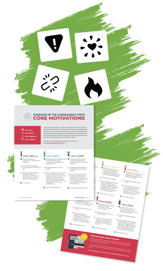 To pinpoint your core type, check out the Core Motivations PDF. This free download breaks down the core desires, fears, weaknesses, and longings of each type, helping you see which one truly explains why you do what you do.
